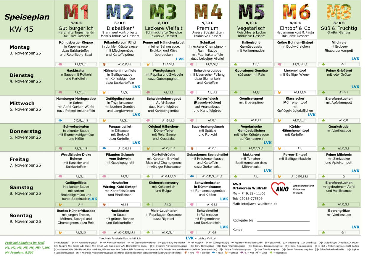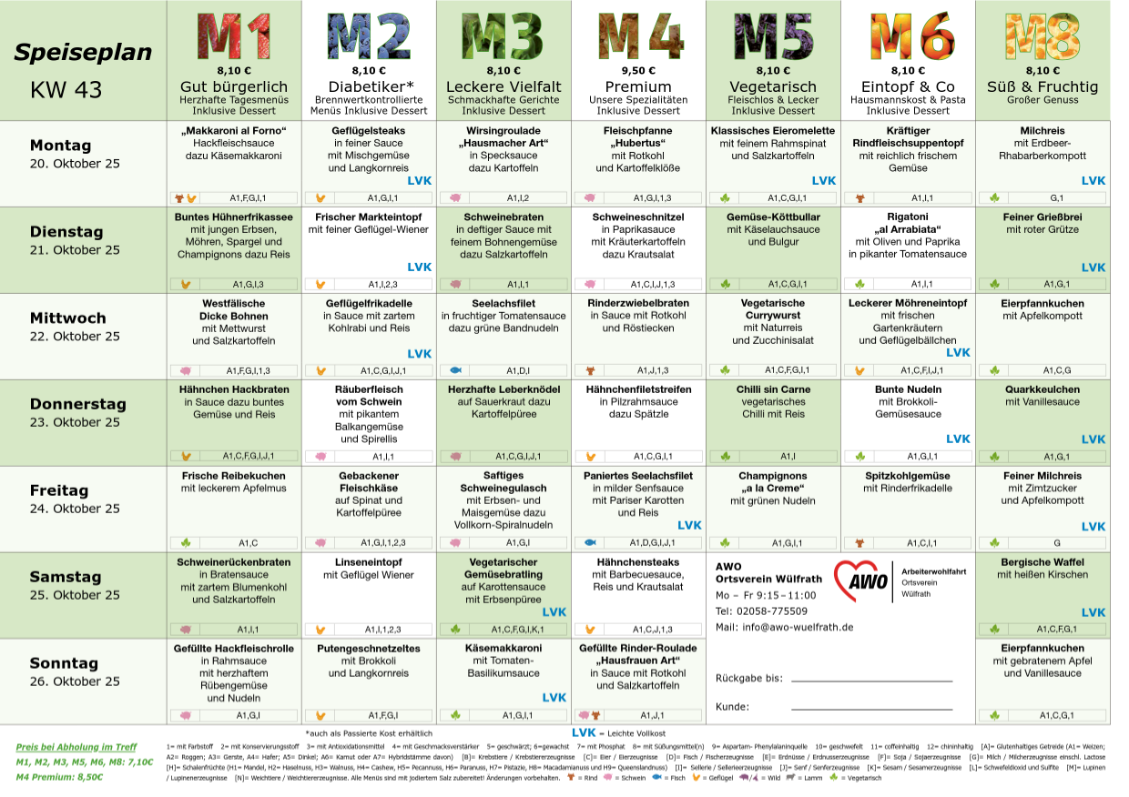 Die Umstellung haben wir am 29. April 2024 begonnen. Die Kunden sind bisher sehr zufrieden.Die ersten Speisepläne können auf dieser Seite heruntergeladen werden. Die Kunden bestellen genau wie beim vorherigen Anbieter, Sie suchen auf der grünen Menükarte ihre Menüs aus, schreiben ihren Namen und die Adresse auf die Menükarte und geben die Bestellung beim Fahrer ab oder lassen sie per Mail, Telefon oder direkt der AWO zukommen: 02058-775509 – Info@awo-wuelfrath.de.