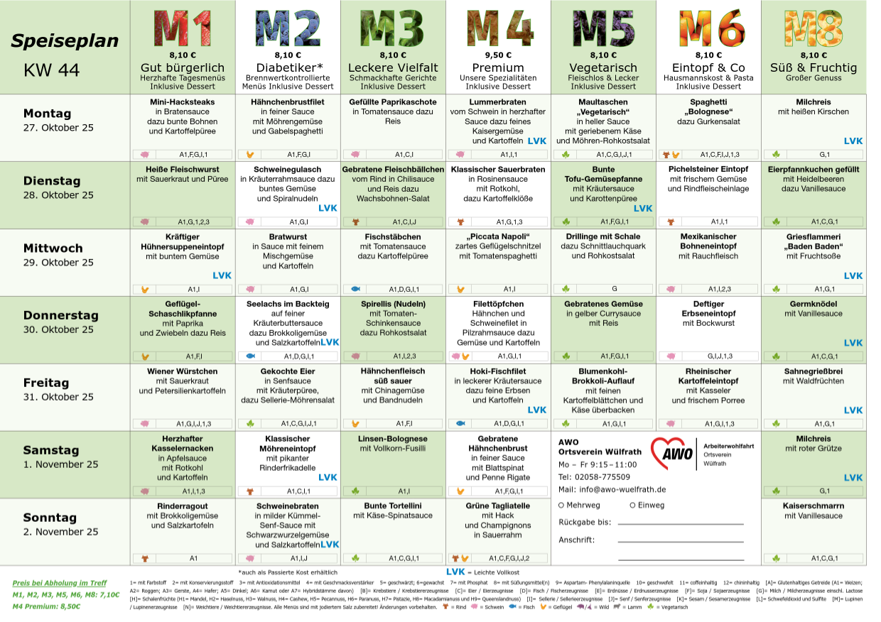 Durch den neuen Anbieter kann die AWO die Vielfalt und die Saisonalität des Essens wesentlich steigern. Die Kunden können zukünftig aus sechs verschiedenen Menüs auswählen. Wobei ein Menü – M 4 – das Premiummenü, 8,80 € kostet. Da alle anderen Menüs von gut Bürgerlich, über Vegetarisch, leckere Vielfalt, Diabetiker und unser Eintopfgericht, für 7,50 € zu haben sind und genauso gut und lecker sind, ist das Premiummenü nur ein Angebot.