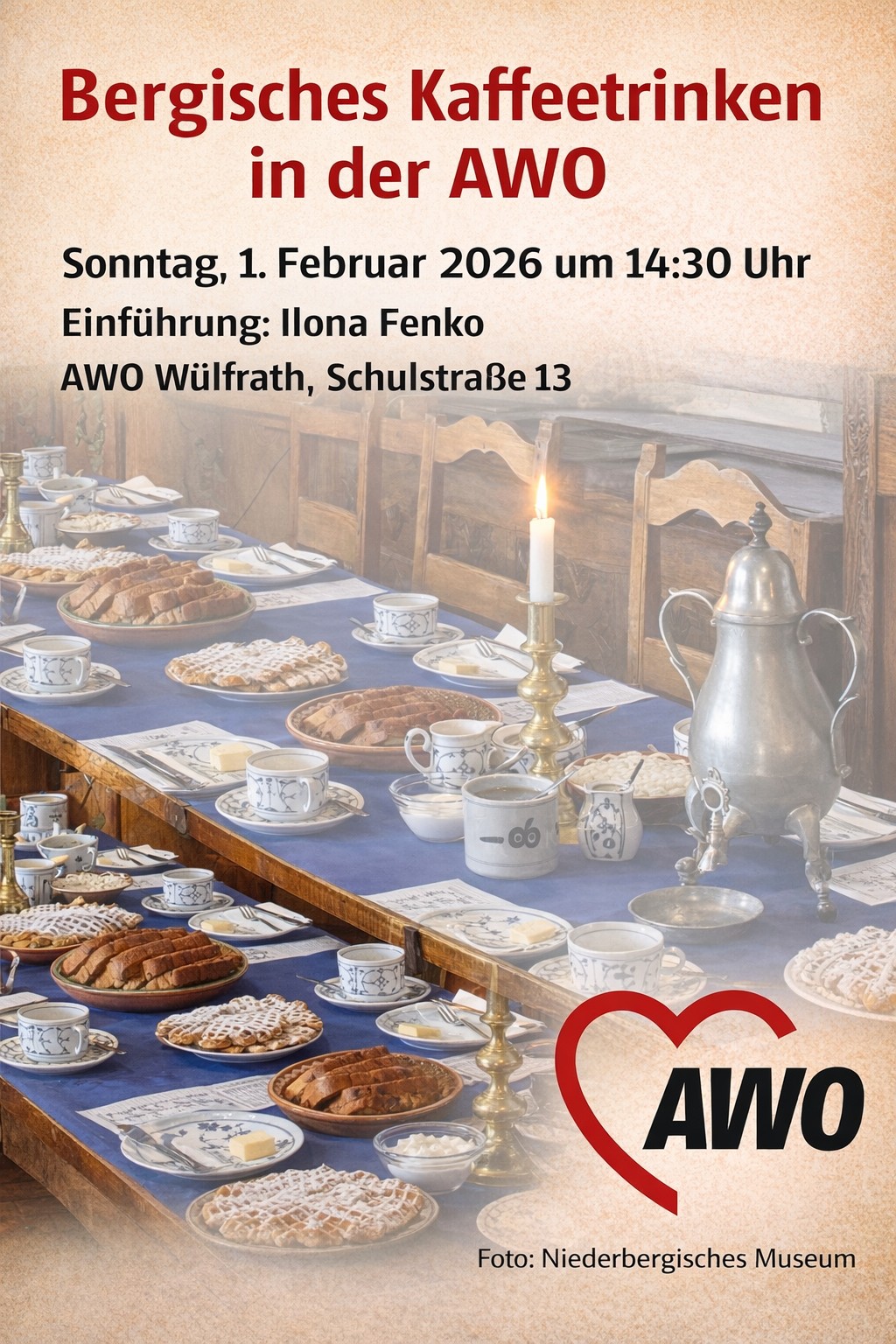 Am Sonntag, den 1. Februar um 14:30 lädt die Wülfrather AWO im Rahmen ihres Sonntagscafés zum Bergischen Kaffeetrinken ein. Die Besucherinnen und Besucher können sich auf einen schönen Nachmittag mit der traditionellen bergischen Kaffeetafel freuen. Eine Einführung über Historie und Zeremonie dieser bergisch bäuerlichen Tradition wird von Ilona Fenko vorgenommen. Das bergische Kaffeetrinken kostet 12 Euro.