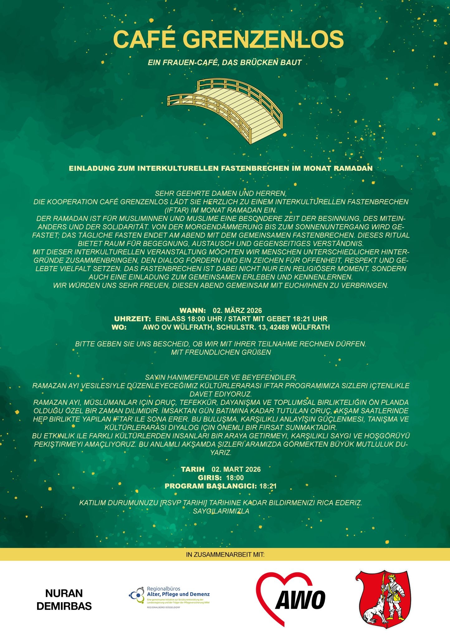 Mit dieser interkulturellen Veranstaltung möchte das Cafe Grenzenlos Menschen unterschiedlicher Hintergründe zusammenbringen, den Dialog fördern und ein Zeichen für Offenheit, Respekt und gelebte Vielfalt setzen. Das Fastenbrechen ist dabei nicht nur ein religiöser Moment, sondern auch eine Einladung zum gemeinsamen Erleben und Kennenlernen.