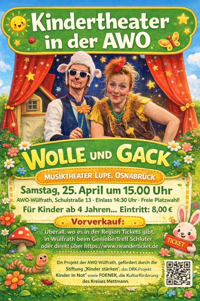 Das Theater tritt am 25.04.2026 um 15:00 Uhr im AWO-TREFF Arbeiterwohlfahrt Wülfrath auf.